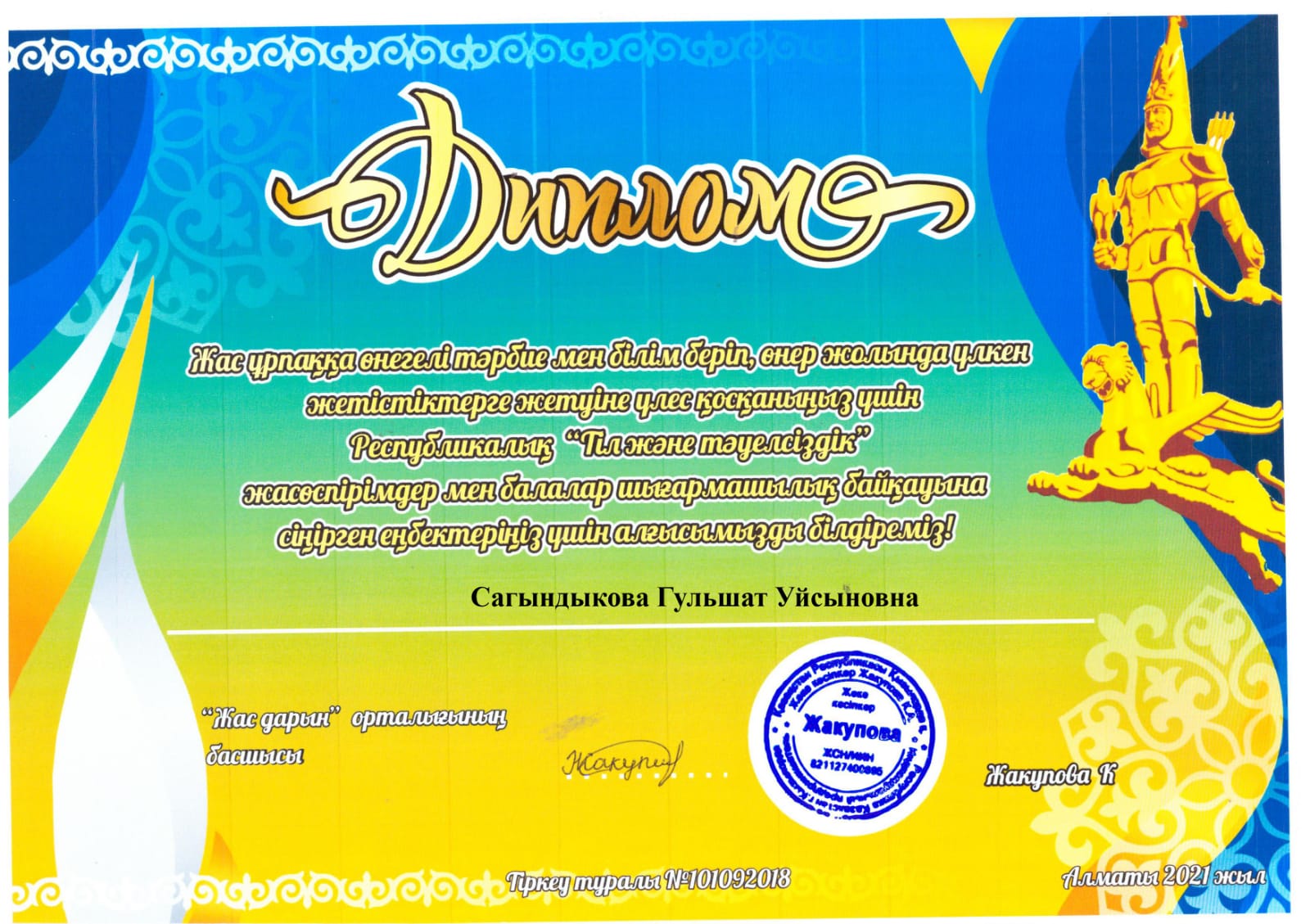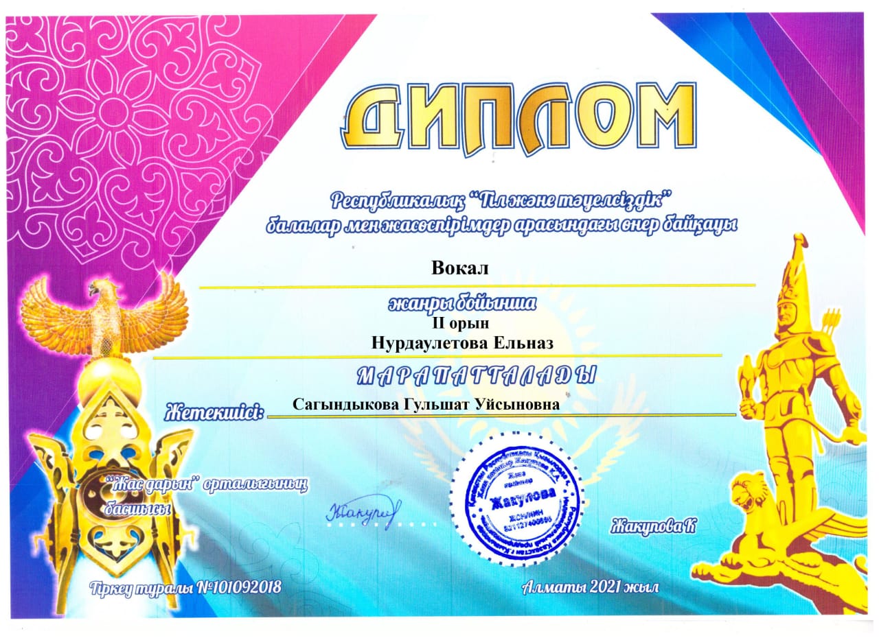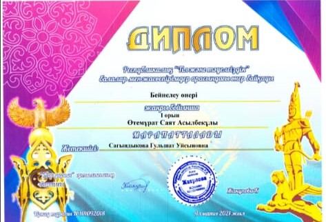 Республикалық "Тіл және тәуелсіздік" балалар мен жасөспірімдер арасындағы өнер байқауына Сагындыкова Гульшат Уйсынова жетекшілігімен қатысып, орын алып келген біздің студенттердің марапаттары: